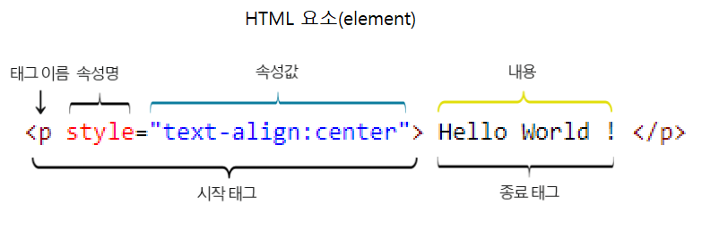 요소 : 시작태그, 내용, 종료태그로 구성되는 하나의 명령어이다.
